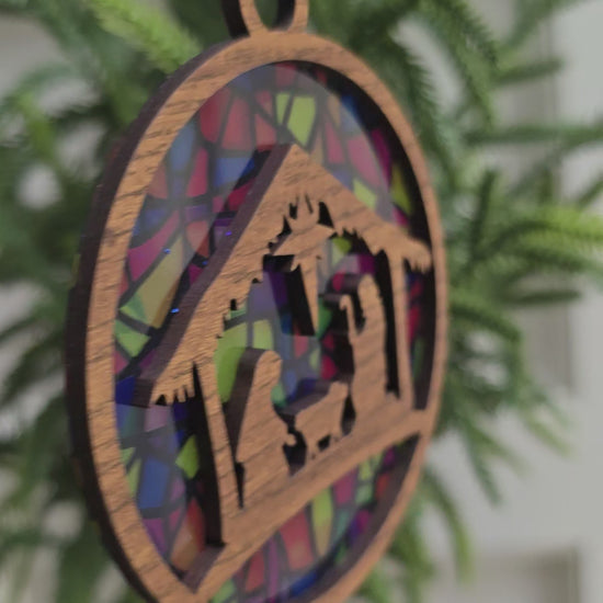 This elegant nativity ornament depicts Mary beside the manger, carefully crafted from wood and flexible acrylic to emulate the beauty of stained glass. Its understated design speaks to the power of simplicity, capturing a timeless moment. Measuring 3.5 inches, it offers a refined accent to enhance your holiday decorations.